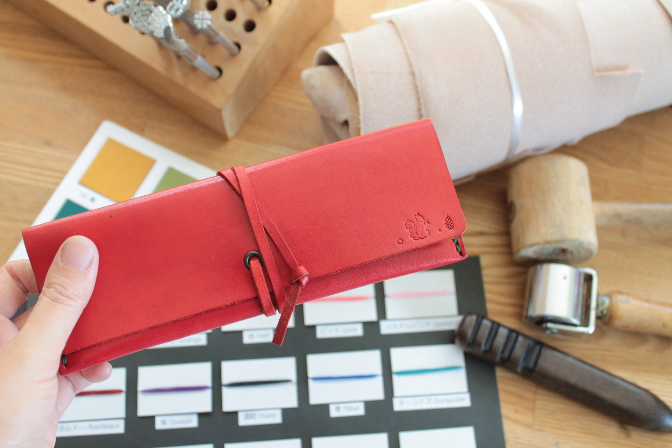 ※染色、裁断、穴あけ、縫製、金具の取り付け工程があります。